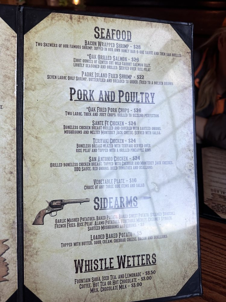 Garlic mashed potatoes, baked potato, baked sweet potato, steamed broccoli, French fries, rice pilaf, Alamo potatoes, vegetable medley, creamed spinach, sauteed mushrooms and onions.