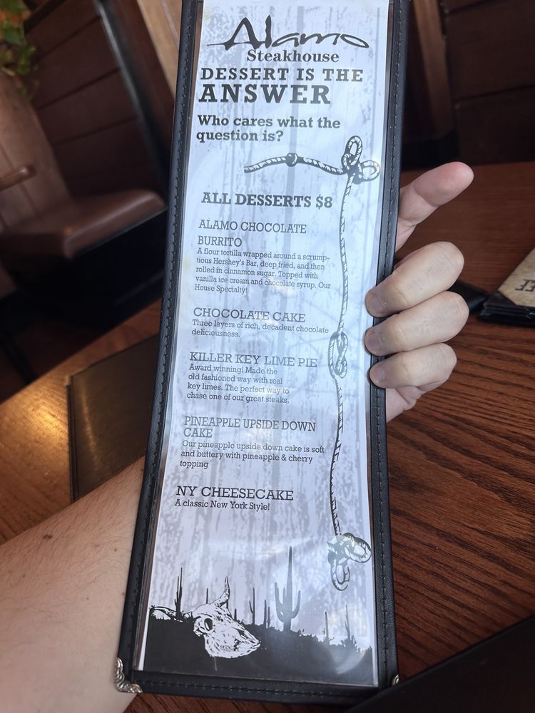 Alamo Steakhouse is a beloved local spot in Pigeon Forge, TN, offering a range of options for all diners. With excellent steaks that are worth the wait, friendly and attentive servers like Andrei and Andy, and a clean, welcoming atmosphere, it's easy to see why customers keep coming back. The menu features not only top-notch steaks but also keto and vegetarian options, catering to various dietary preferences. The staff goes above and beyond to accommodate guests with allergies, ensuring a pleasant dining experience for all. The casual ambiance, delicious food, and impeccable service make Alamo Steakhouse a must-visit in the area. Whether you're craving a hearty steak or a lighter meal, this restaurant has something for everyone.